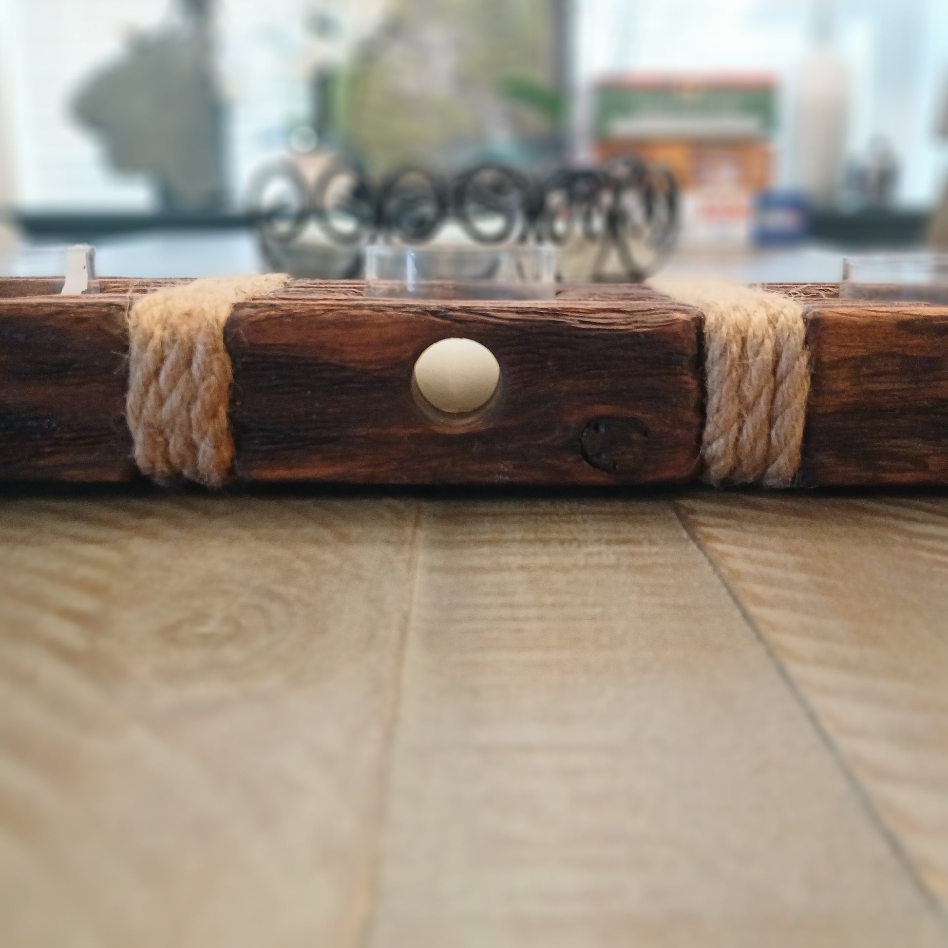 Seafarer's Lantern. Hand-carved from rugged, distressed wood and bound with coarse rope, this piece holds the spirit of the open sea. It's the kind of fixture you'd find on a captain's table—built to withstand the roll of the waves and cast a steady light against the darkest night. The weathered wood tells a story of long voyages, while the thick rope serves as a constant reminder of strength and purpose.